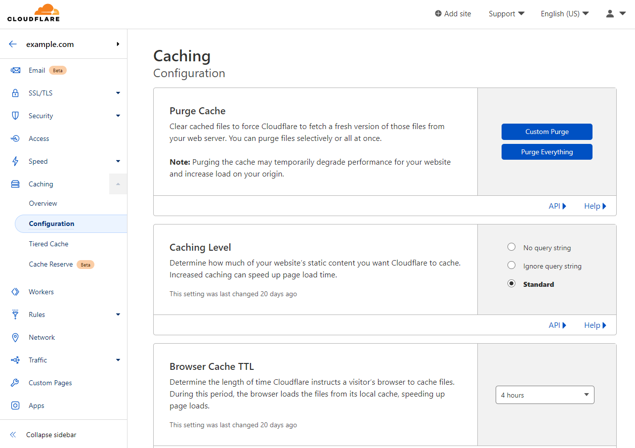 To access this Cloudflare feature, head to Caching -> Configuration. Some of the main features include: