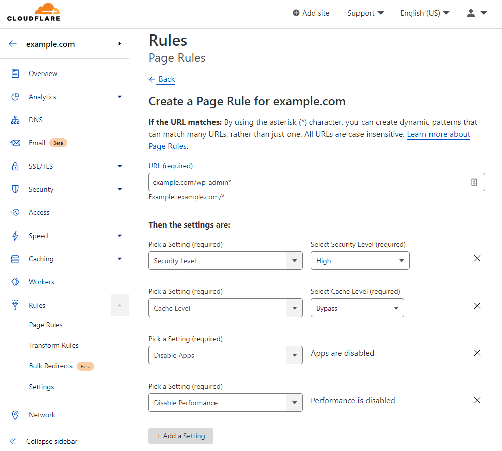 Here are the steps to set up Cloudflare page rules: