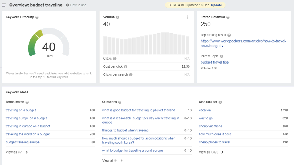 To do that, conduct keyword research using tools like Ahrefs. Simply head to Keywords Explorer, enter your travel niche, and the tool will show a list of popular keywords.