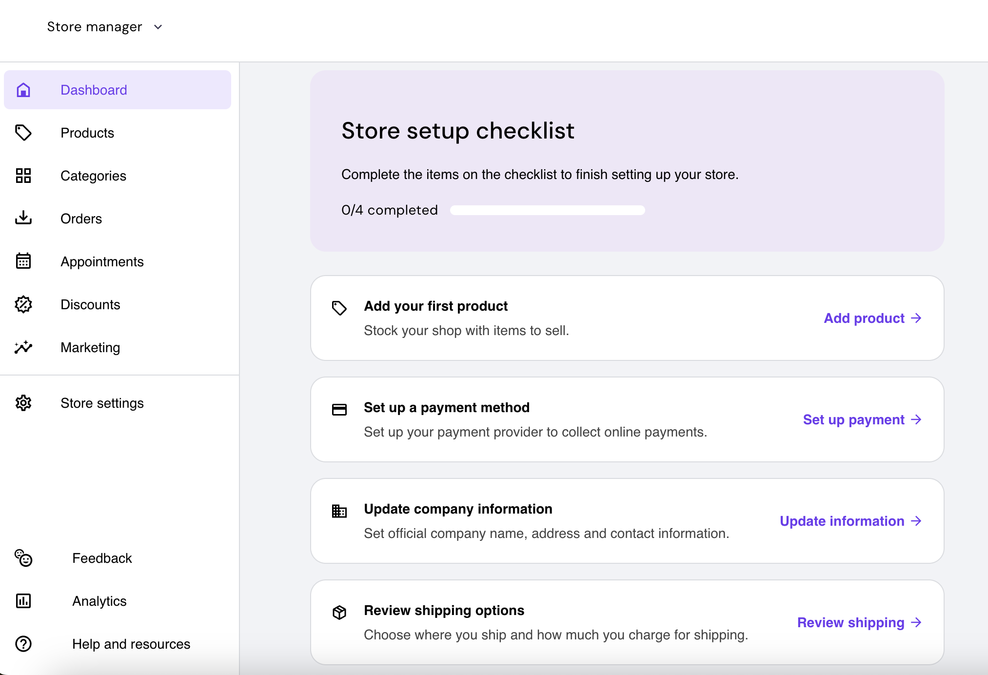 To do so, start by setting up the online store’s country and currency. Then, it’ll take you to the store manager dashboard.