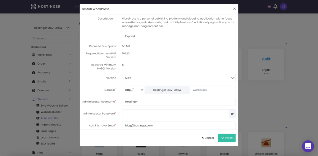 Once you’re all set, it’s time to install your CMS. This can be easily done using our hPanel. Navigate to your hosting account, select the Auto Installer option and choose WordPress.