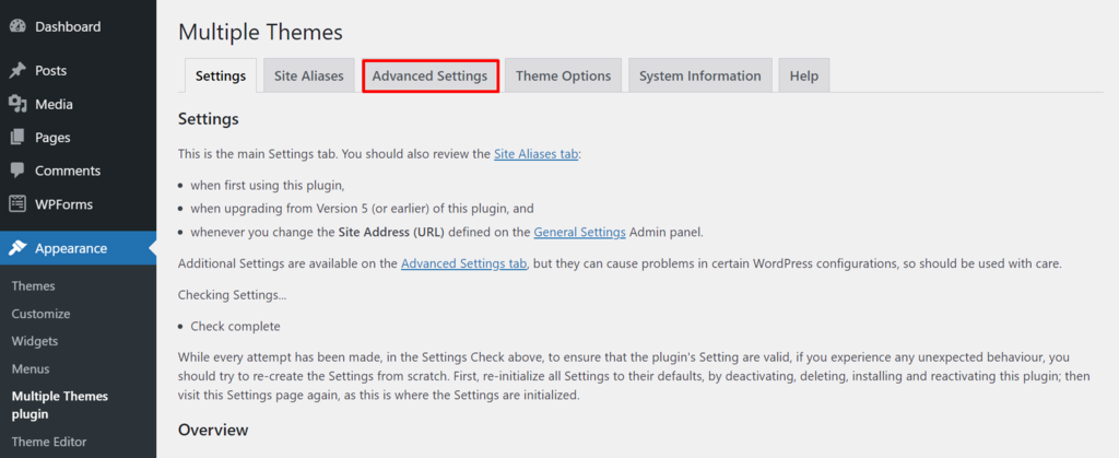 If you want to modify a specific page without changing the other pages’ themes, head to Appearance Multiple Themes plugin. Then, click the Advanced Settings tab.