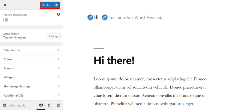 After activating the theme, go to Appearance Customize and modify the template to your liking. Once complete, click Publish to save the changes.