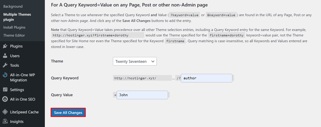 A screenshot from the Multiple Themes plugin's dashboard showing examples of the theme - Twenty-Seventeen, query keyword - author and query value - John.