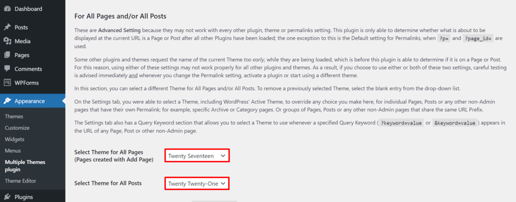 Keep in mind that Multiple Themes can’t change WordPress admin panels. It’s also recommended not to use paid themes and plugins when utilizing this plugin.