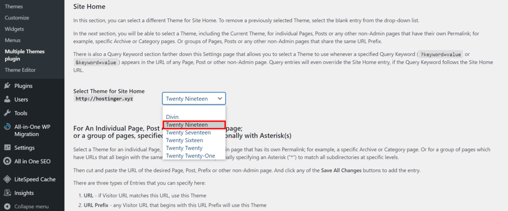 3. Set up Multiple Themes – head to the plugin’s settings page to set a specific theme for the homepage or add multiple themes to particular pages based on their URLs, prefix URL, and query keyword.