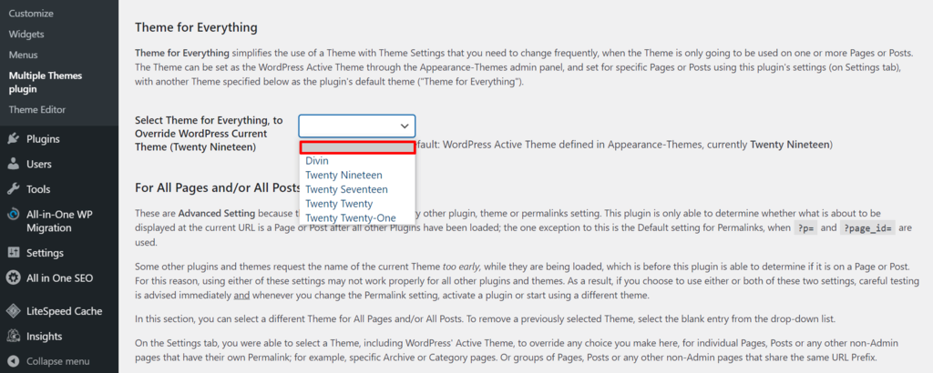 Once you’re finished, leave the setting as it is or go back to Multiple Themes plugin Advanced SettingTheme for Everything and select the blank option from the drop-down menu.