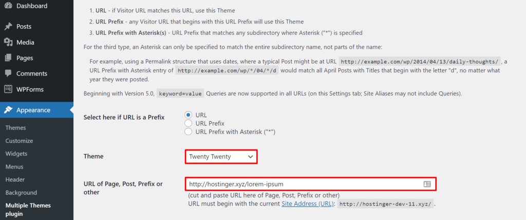 On the Select here if URL is a Prefix option, choose URL. Then, click on the Theme drop-down menu and pick one of the available themes – we have chosen Twenty Twenty. After that, type your site URL in the URL of Page, Post, Prefix or other field.