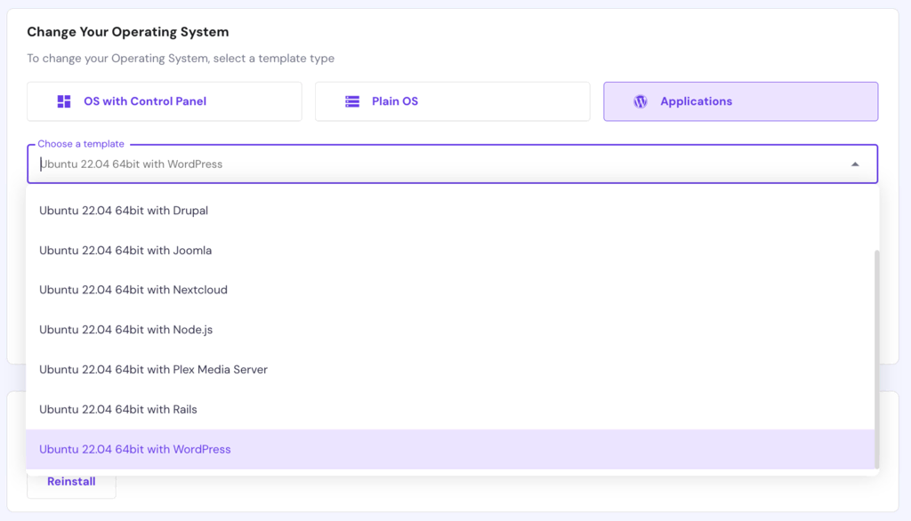 Hostinger offers templates that let you change your server’s operating system and install an application in one click. These templates make the VPS configuration process faster and easier since you don’t need to manually install the software individually.