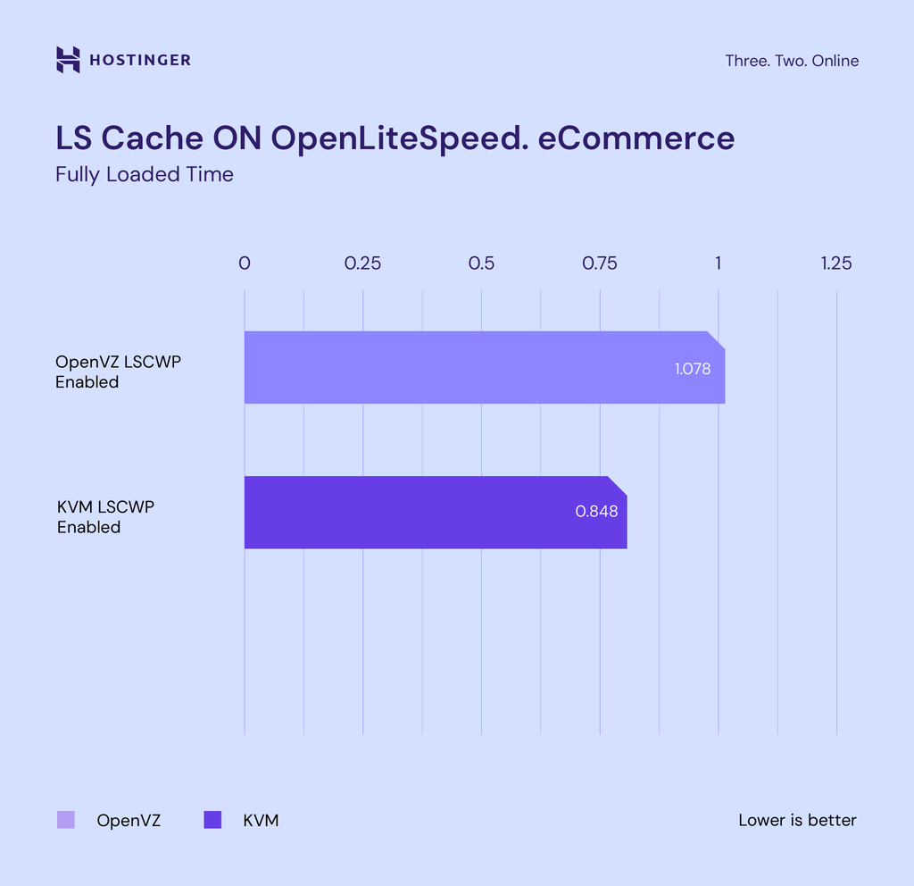 For an eCommerce WordPress site, both plans perform similarly. However, the KVM plan offers 8% and 11% faster loading time, with the LiteSpeed caching plugin enabled and disabled, respectively.