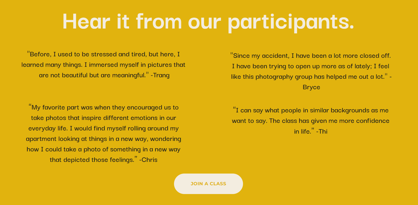 The New Lens website has user-friendly navigation. The homepage’s content clearly explains the program and showcases photo galleries. Every page of the website leads to the Get Involved page, encouraging visitors to join the program.