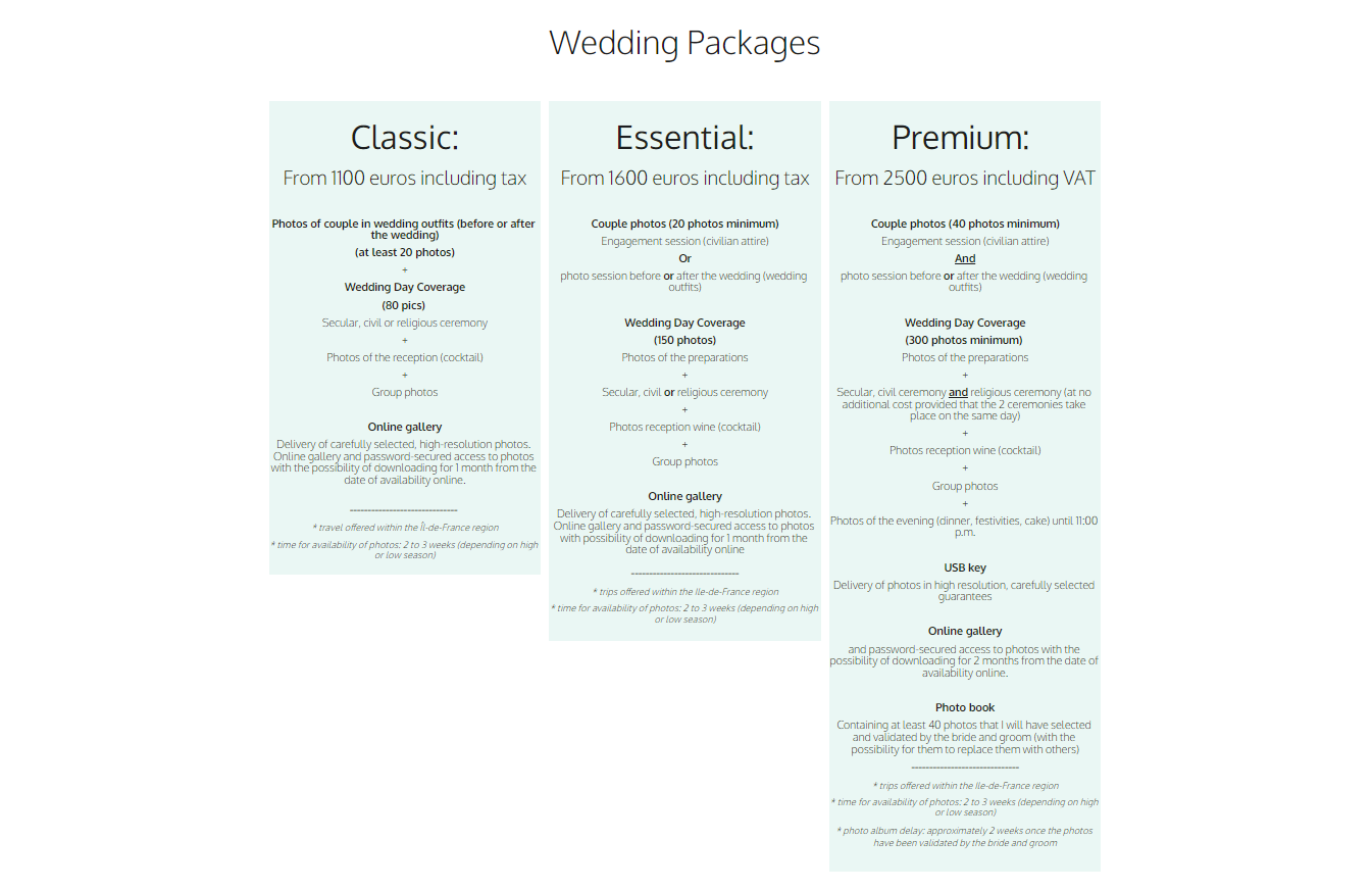 Fellow wedding photographers can learn from how Wallois arranges the service packages. The packages are put side-by-side, allowing visitors to easily compare and pick the best one.