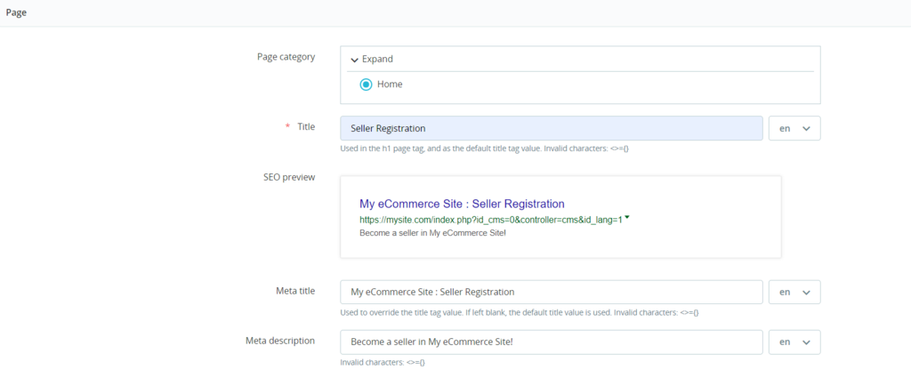 Important! Check the SEO preview to see how the meta title and meta description will appear on search engine results pages. Don’t include the characters ,=,{, or } in these two elements, or they will be considered invalid.