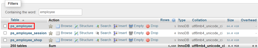 Type in employee on the filter bar and select the (prefix)_employee table. The default prefix is ps.
