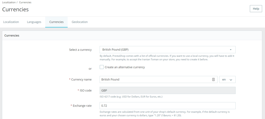 Choose the currency you want to add and fill in the exchange rate calculated from your current default currency. In this example, we’re adding the British Pound (GBP), while the current default currency is the United States Dollar (USD).