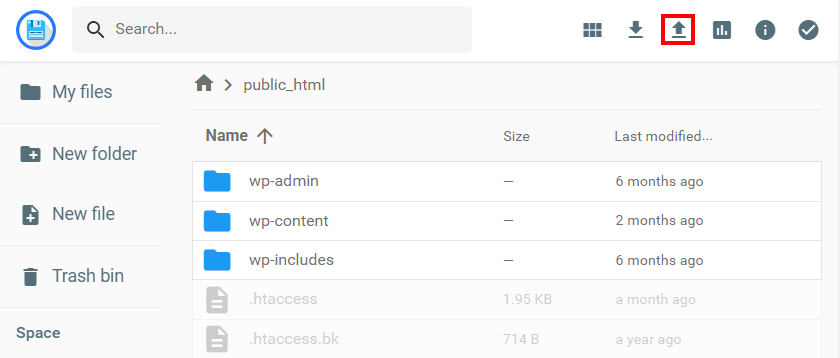 We’re going to install PrestaShop in a root directory, so open the public_html folder. Then, click the Upload Files icon at the top-right.