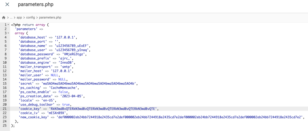Open the app → config folders, then locate a file named parameters.php. Click to open it.
