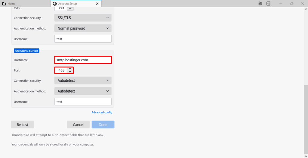 Screenshot from the Thunderbird's account setup highlighting the hostname and port.