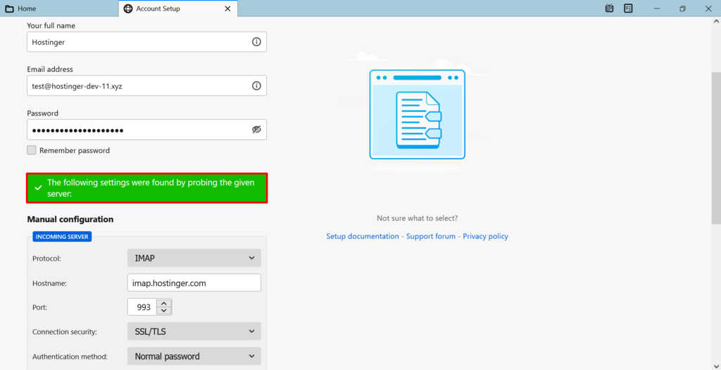 Once you’re done, click the Re-test button to test your manual settings. If the settings are valid, Thunderbird will show a quick response like this: