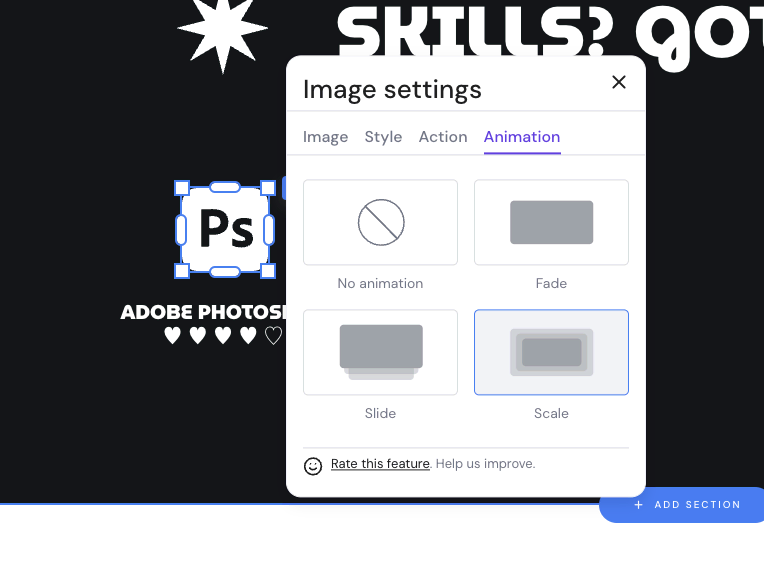 Tools like Hostinger Website Builder simplify integrating these micro-interactions into your web design. Add different types of micro-interactions, like animations, to images and icons in the image settings.
