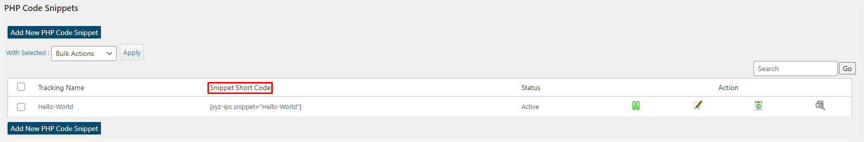 Select Add New PHP Code Snippet and insert your code into the field. To demonstrate, we’ve added the Hello World PHP script from the previous section next to the PHP code section.