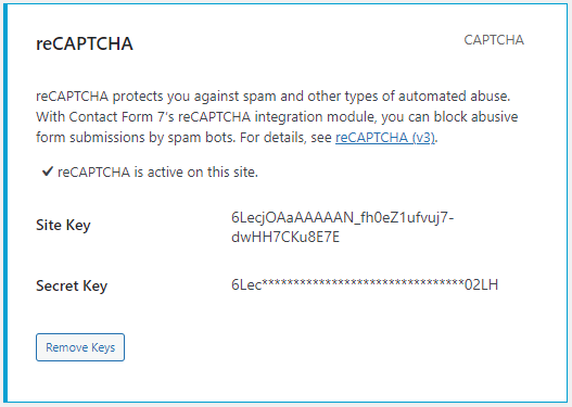 After you fill out the form, click on the Submit button. Google will generate a site key and a secret key. Use the site key in the HTML code of your site and the secret key for communication between your site and reCAPTCHA.