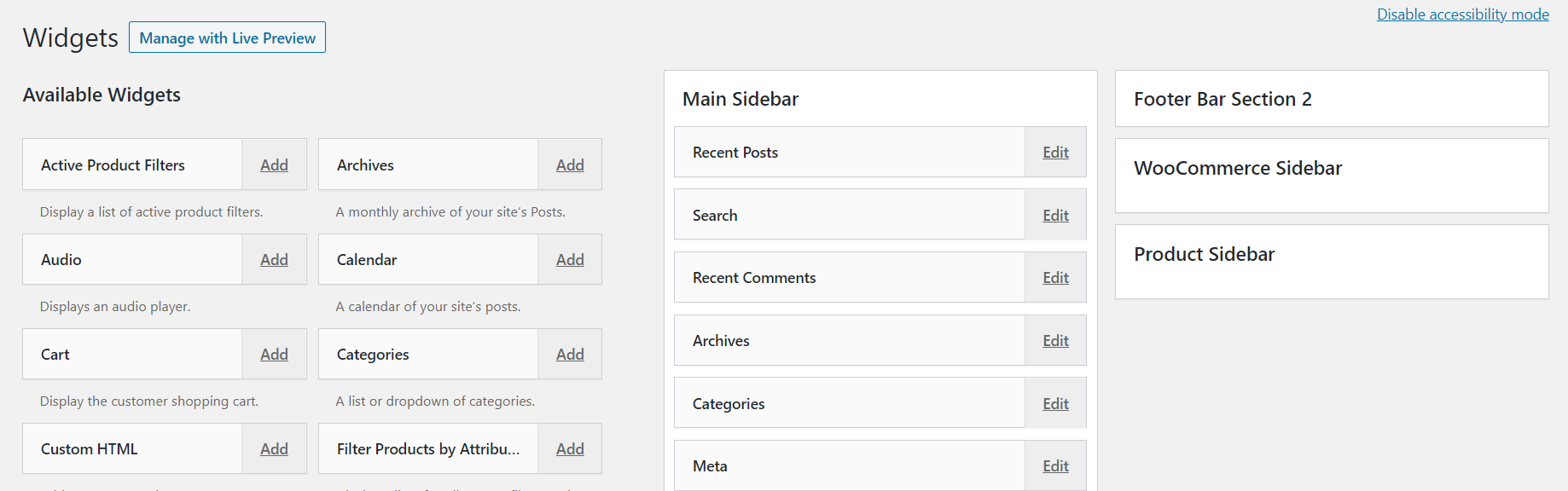 WordPress also provides accessibility mode. Click the Enable accessibility mode link on the top-right of the page, and you’ll immediately see the Widgets menu with the Add and Edit buttons.