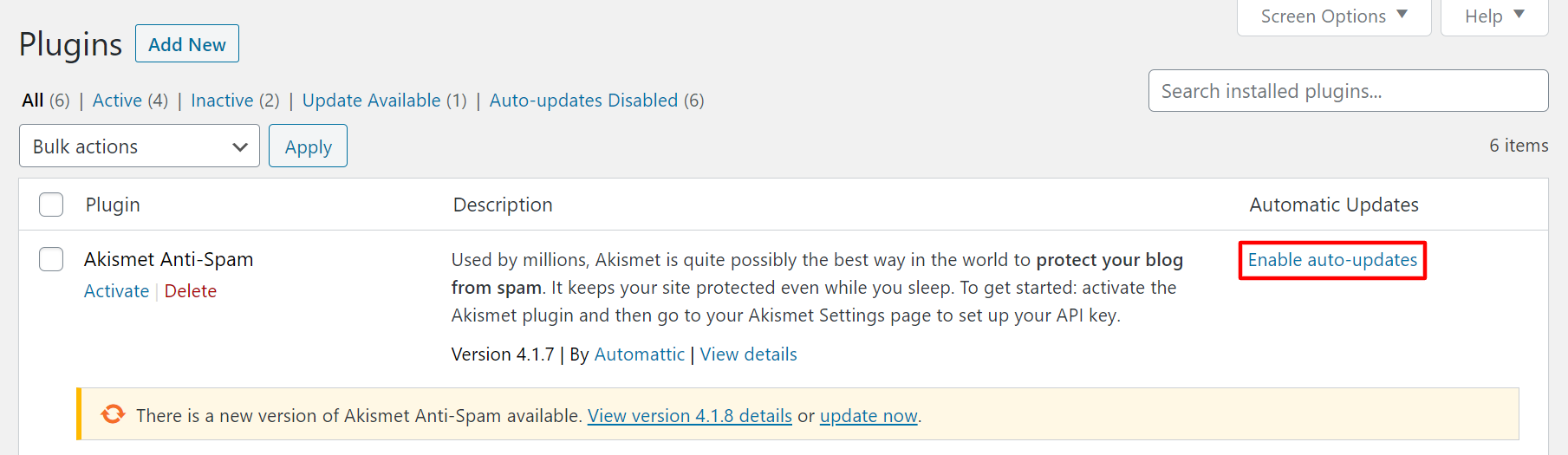 • To toggle automatic updates, click Enable auto-updates under the Automatic Updates column for each plugin.