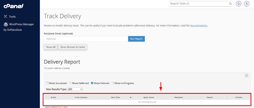 The report will appear in the table below. The contents of the table can also be filtered as needed. If you only want to display emails that failed to be sent, click Show Failures checkbox.
