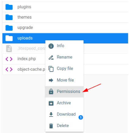 Set Correct Permissions on wp-content/uploads: This directory should be writable by WordPress. Set the permissions of the uploads folder to 755 (directories) and 644 (files). To adjust the permissions, right-click the uploads directory, then select Permissions:
