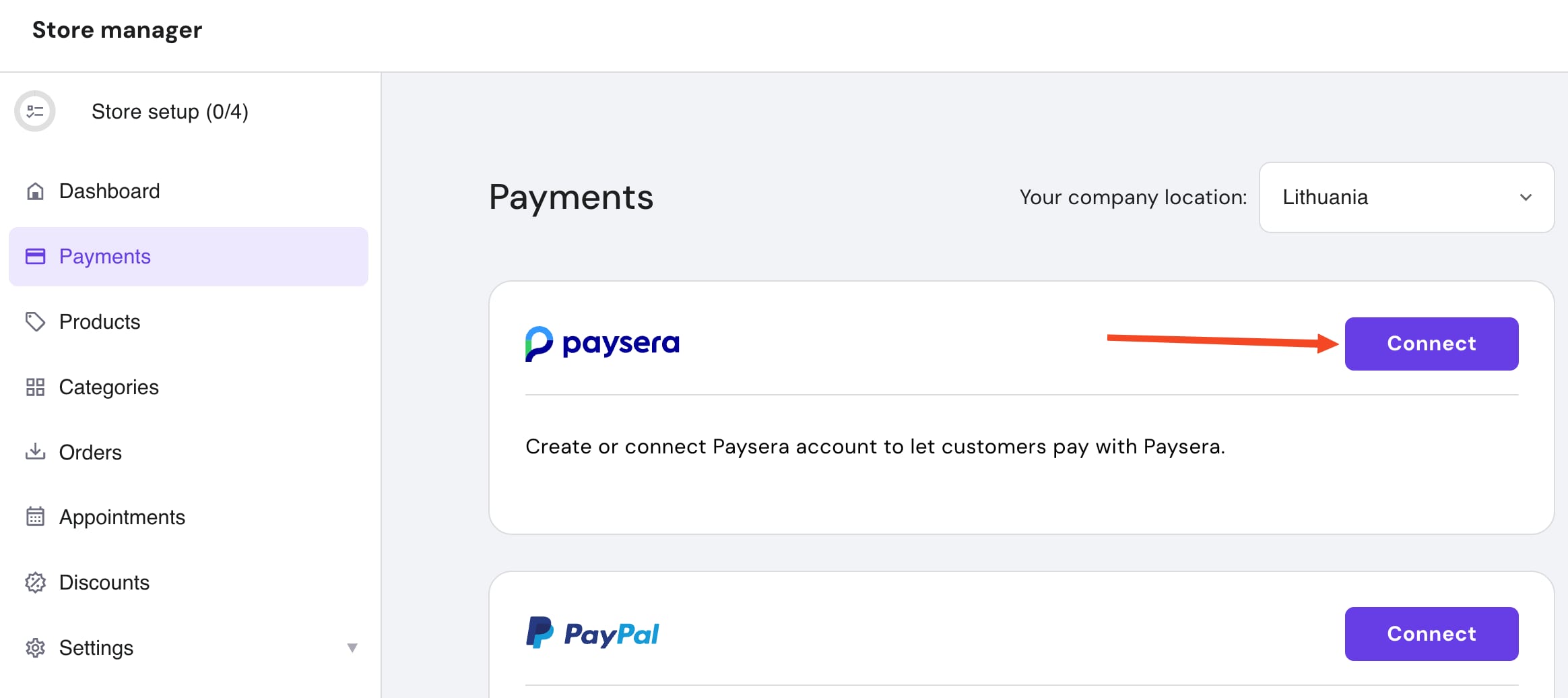 To enable Paysera, within the builder, navigate to the store management area → Store settings → Payments and click on Connect next to Paysera: