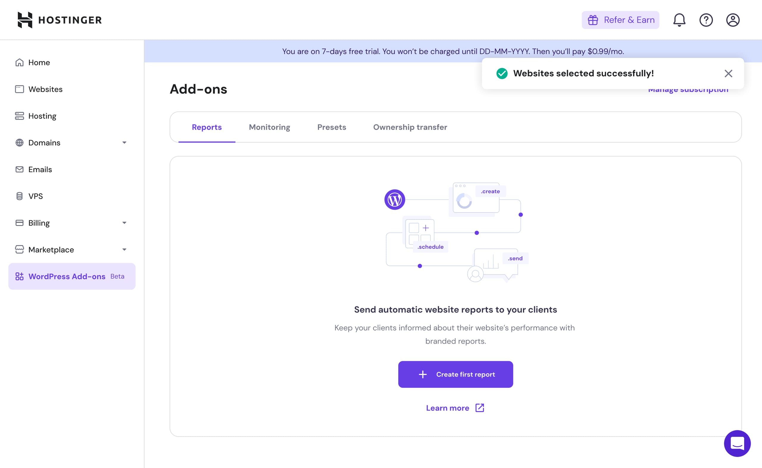 WordPress Add-ons are included by default for Cloud plan users. If you’re not on a Cloud plan, start by activating the 7-day free trial, and once it ends, subscribe to the WordPress Add-on bundle in your hPanel. You can choose these for 1 website, 10 websites, or Unlimited websites.