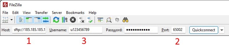 Open FileZilla and fill in the Quickconnect section with the configuration you got from the SSH Access section:
