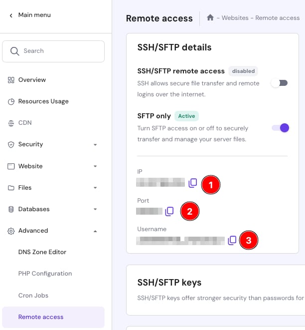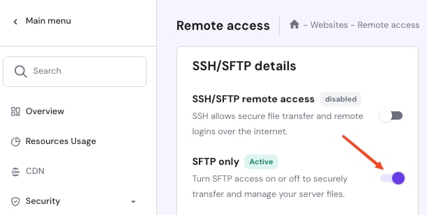You have enabled remote access by going to the Remote access page on hPanel and clicking on the toggle next to SFTP only: