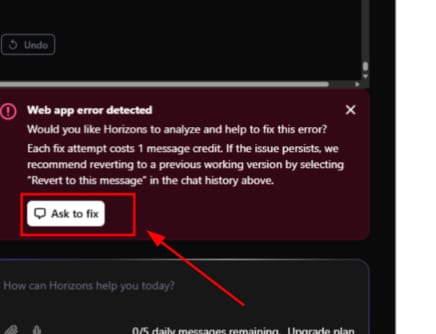 If Horizons shows a pop-up suggesting a fix, click Ask to Fix and wait (it counts toward your daily message limit.)