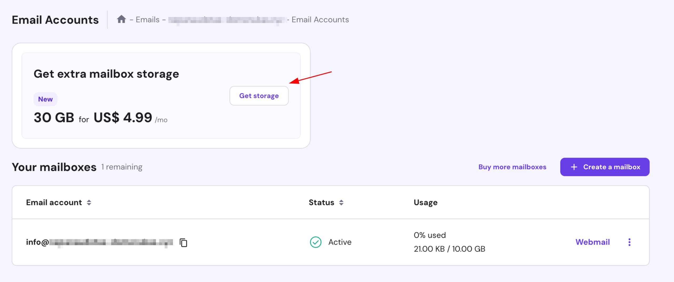 This feature is available exclusively on the Mailboxes page and allows you to purchase an additional 30GB of storage for just $4.99/month (or $59.88/year). The payment is made upfront and follows your main email plan’s renewal cycle — meaning its expiration date is the same as your original email plan.