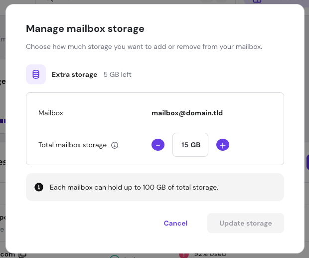 The add-on allows you to purchase extra storage and assign it to specific mailboxes under the same domain.
