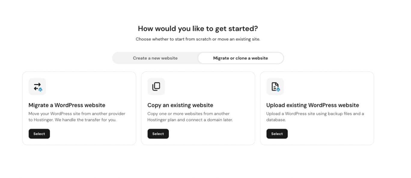 After purchasing your plan, you can start setting up your hosting plan from hPanel. During the onboarding process, you can select the migration option based on your needs:
