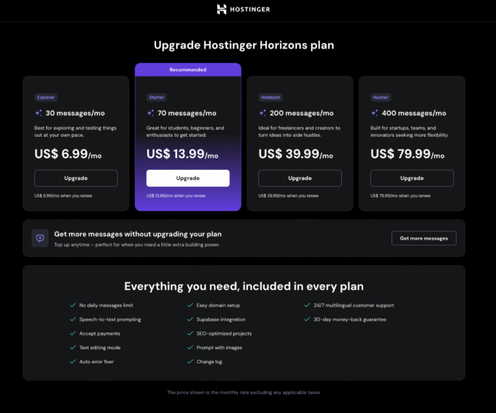 When you proceed with the Horizons upgrade, there is a difference in price between the plans and received messages count based on your previous activity with the tool.