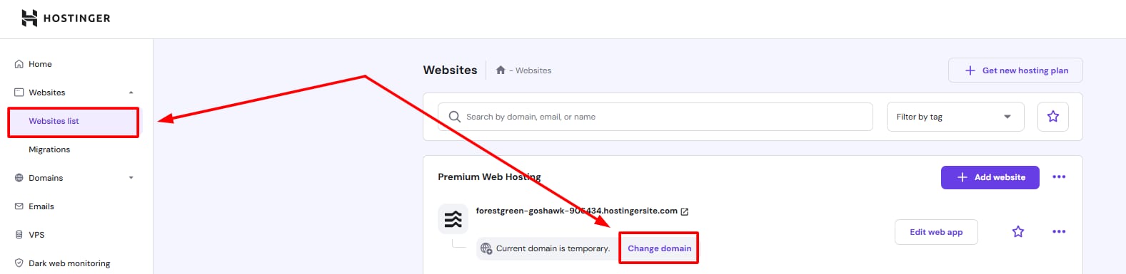 Click on Change domain for the specific web application that you wish to connect to your domain