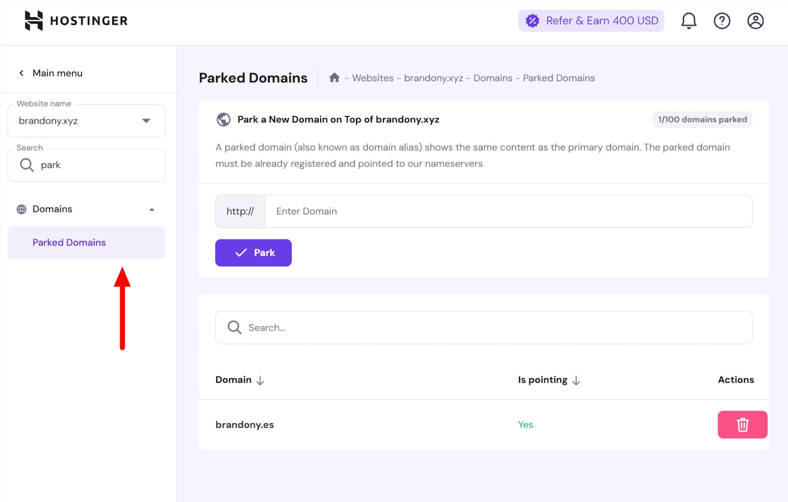 Once your DNS settings have taken effect, go to the Websites tab of your hPanel and click the Dashboard on your primary domain. Then, switch to the Parked Domains tab to enter your secondary domain, and click Park.