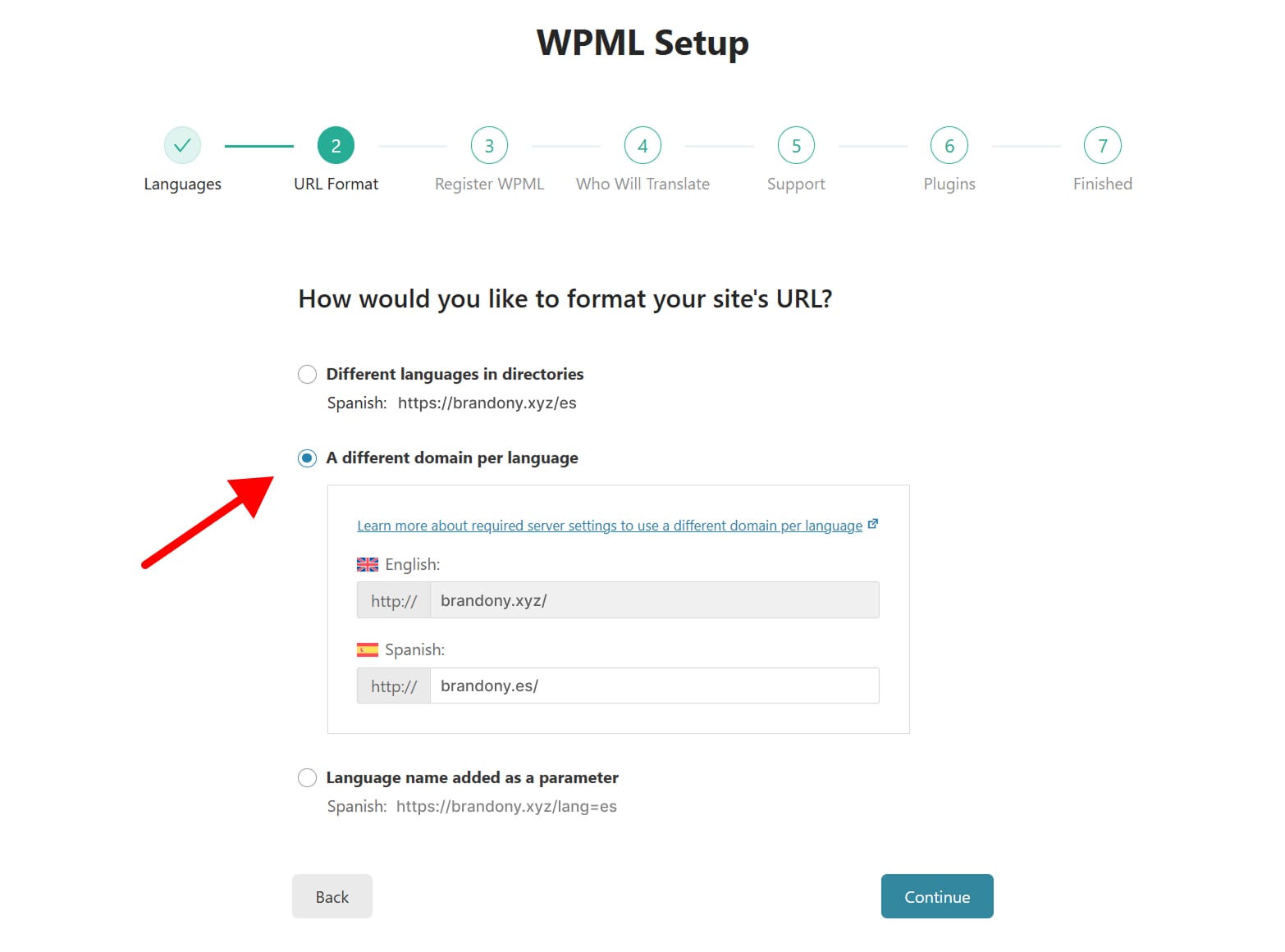 To do this, download the plugin from your WPML account and upload it to your WordPress site. Once activated, go to WPML → Setup and make sure to choose the different domain per language option during step two.