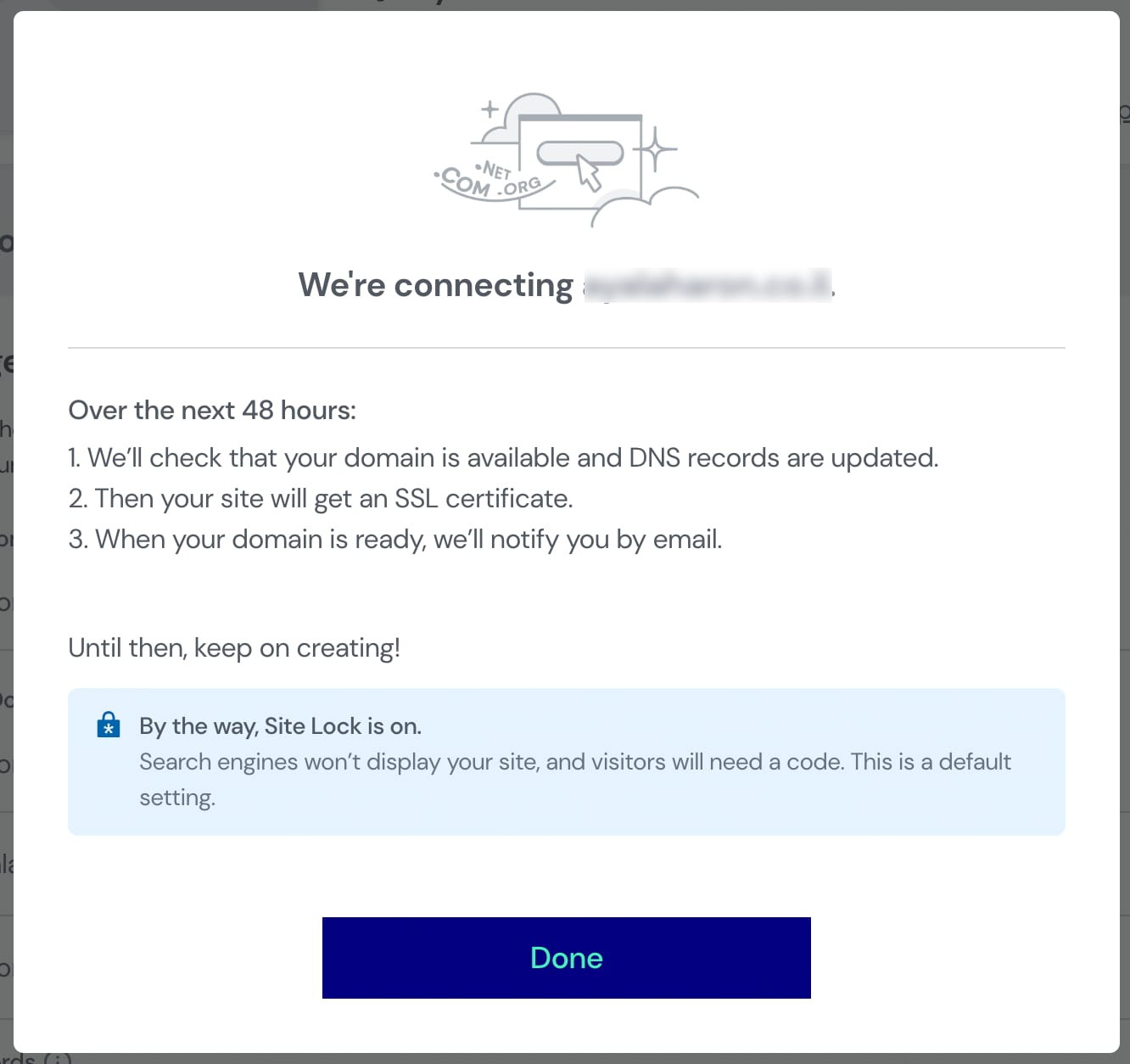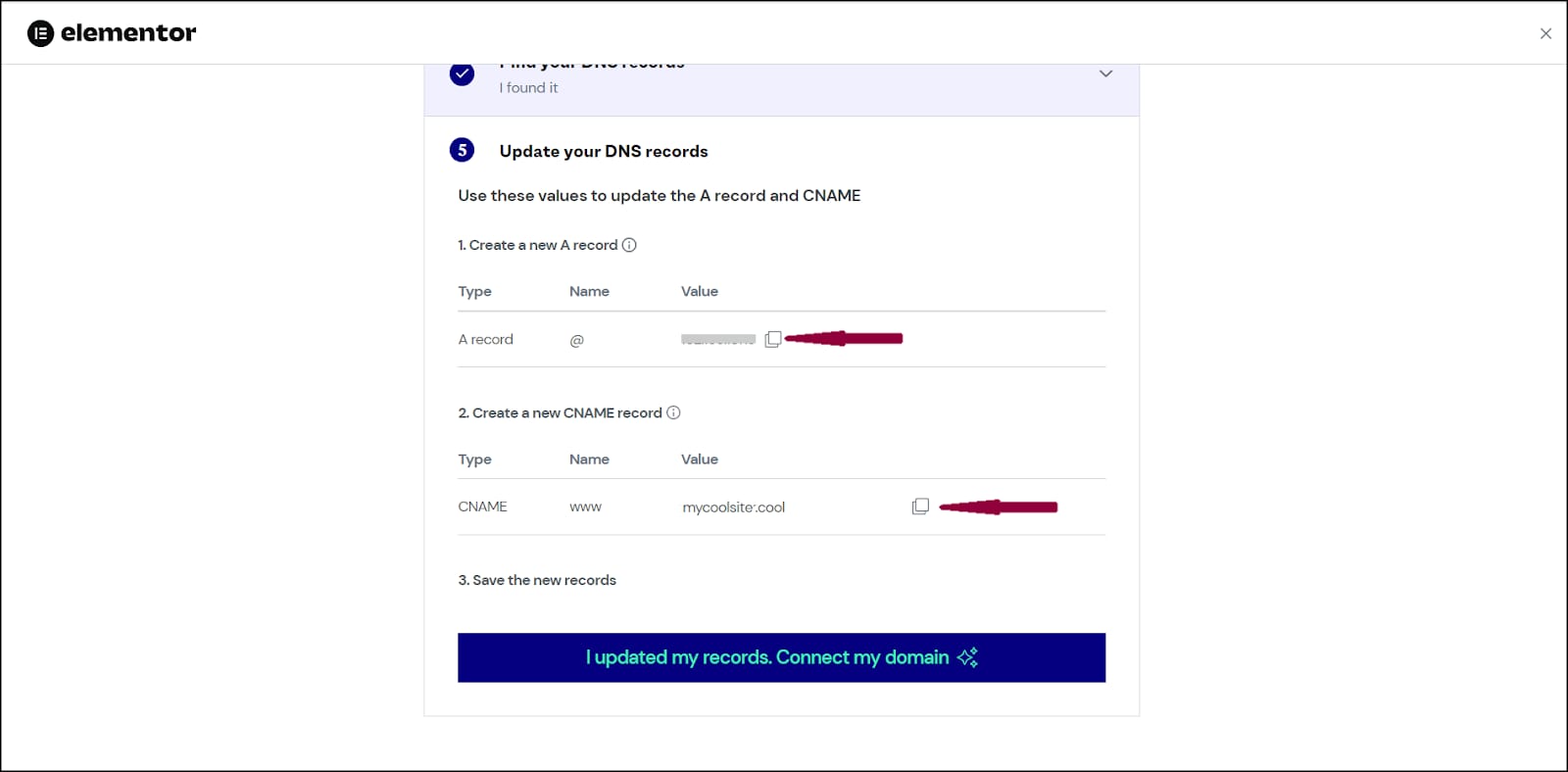 Go back to the Elementor tab and click I updated my records. Connect my domain.