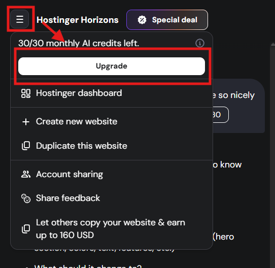 For more information about Upgrades, visit our full guide on How to upgrade Hostinger Horizons.