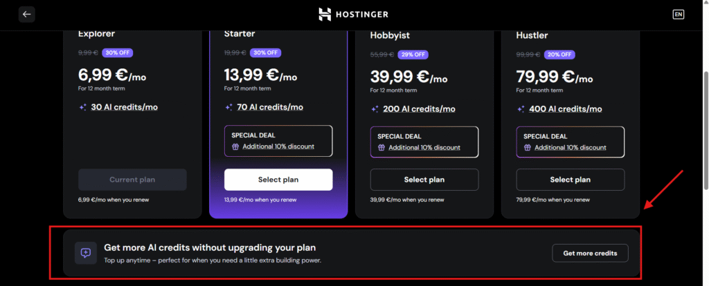 In this guide, you’ll find clear information about the available plans for Hostinger Horizons and the logic behind credit limits and upgrades.