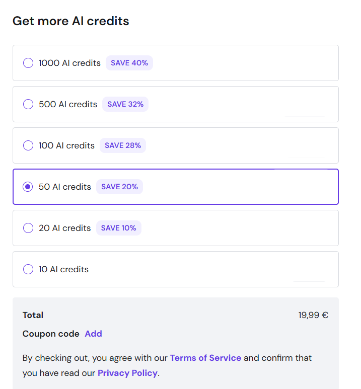 Need more AI credits You can buy additional top-ups without upgrading your plan.