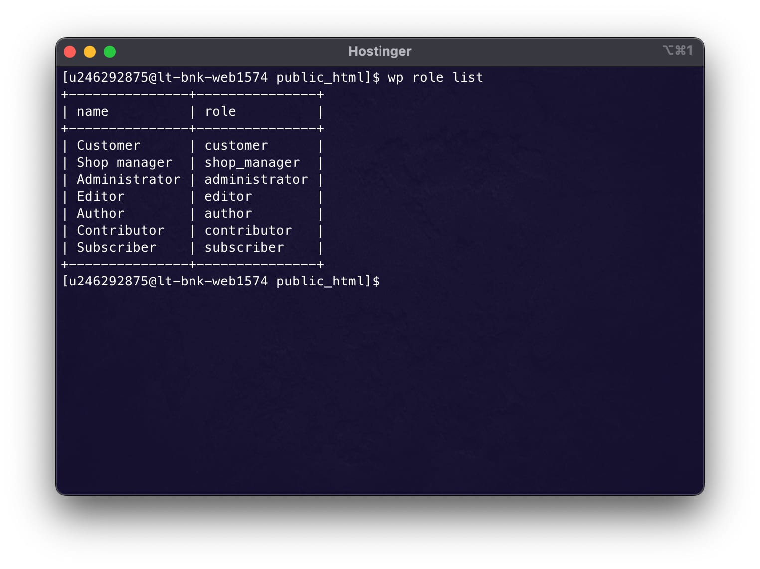 If all default user roles exist, we should verify whether their capabilities are properly assigned. To do that, we can use this command: