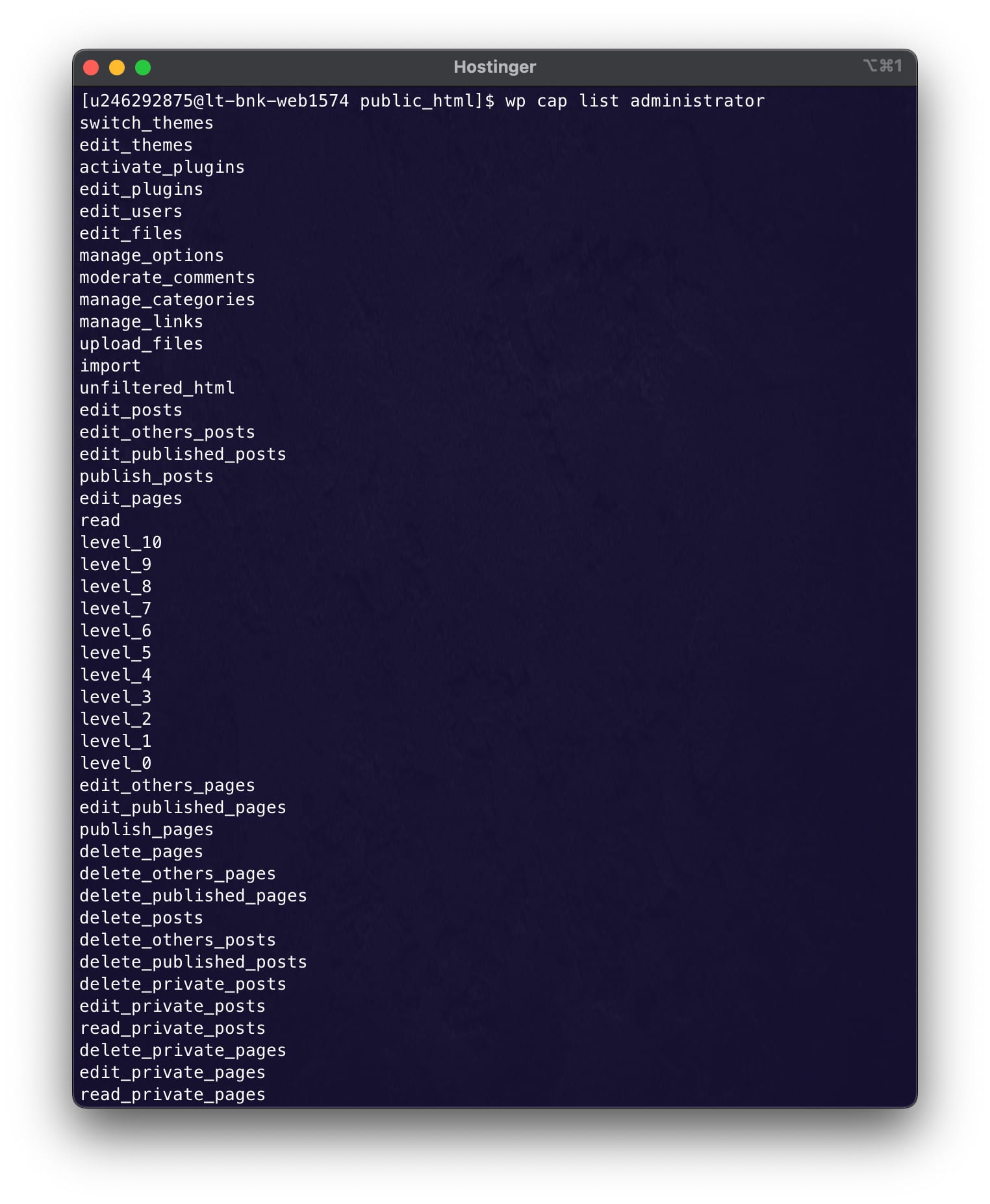 wp cap list administratorTo check other roles, simply replace administrator with the name of the role you want to check.