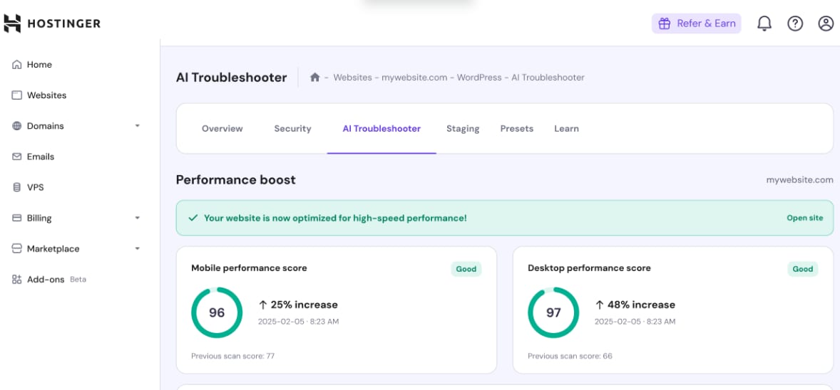 This new AI Troubleshooter functionality will automatically optimize your WordPress website’s performance. The tool detects slow-performing areas of the website and applies the most effective optimization settings to improve speed. It also allows you to compare performance before and after the changes, with the option to revert the optimizations if needed.