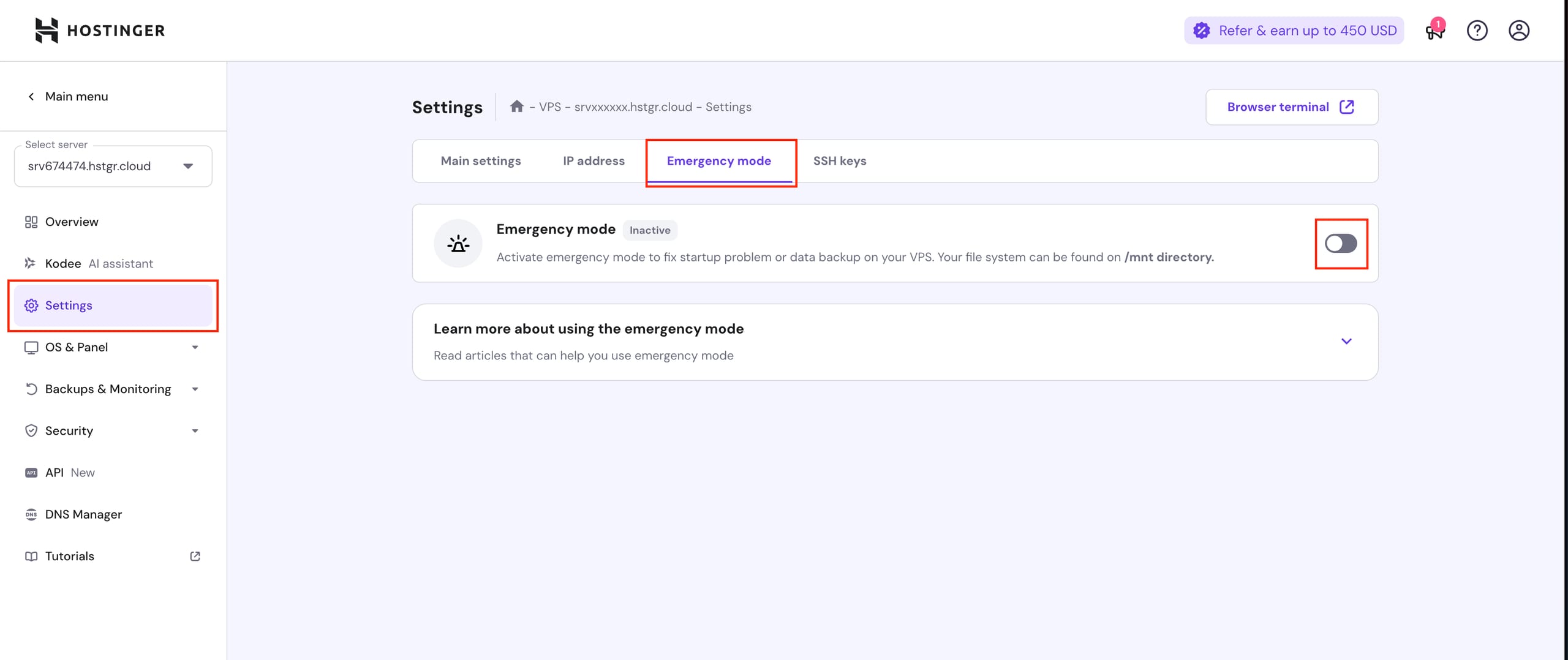 After repairing the file system on your main partition, return to your hPanel VPS settings and turn off Emergency Mode.